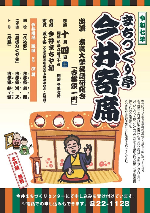 10月4日(土)奈良大学落語研究会の今井寄席を今井まちや館で開催いたします。 |