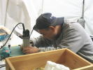 まずは、バナナの叩き売り。「タダ」とか「千円」と言ったらすぐに手を上げないと買えません。値段を聞いてから手をあげても間に合わないので、みんな何か言うと同時に手をあげます。運が悪いと、バナナを千円で買わないといけません。「バナナと九条ねぎと大根で300円」の声に、感心するぐらい大きな声でハイ!と手をあげて、ちゃっかり手に入れたぽんきち。学校でもこんないい返事すればいいのに・・・。手に入れた商品は「バナナUFO〜!」と投げて渡される。ぽんきちはバナナをキャッチできなかったので、私が呼ばれた。ネギや大根が空を飛び、迫ってくる。ボコっと音をたててどうにかキャッチ。恥ずかしかったけど、なかなか楽しかった♪