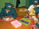 郵便やさんの格好をして、かばんをかけて郵便やさん気分♪