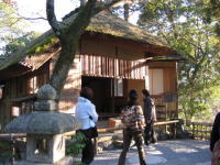南天の床柱と萩の違い棚で有名な3畳の茶室です。