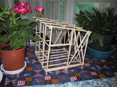 今日は、昨日の天気予報では雨とか言っていたけど、朝から秋晴れだったので、さっそくビックスへ行ってきました。花を選ぶというよりも、安い商品探しに奔走しました。(^_^; あんまりお金かけたくないしね。で、スプレー菊とナデシコを少々。それと、秘密基地を作る材木の費用を調べてみました。長さが180センチもあって350円というのは思っていたより安かったです。まずは、助手と一緒に割り箸でミニ模型を作ることにしました。 |