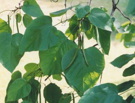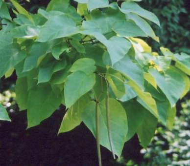 | 川辺などに自生する落葉喬木で高さ6〜9m程にもなる。葉はハート型。 初夏枝頂に円錐形の花穂をなし暗紫色の点のある淡黄色の花を開く。果は30cm程で長くささげに似ているのでこの名がある。 梓はヨクソミネバリ(カバノキ科)ともいわれている。 |