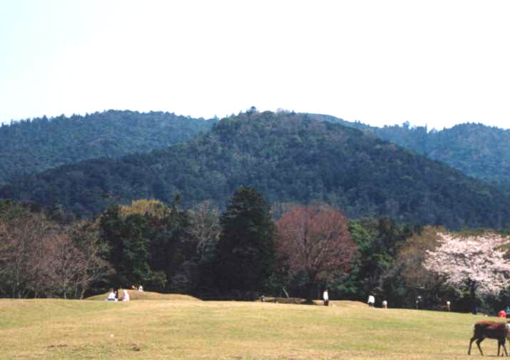 飛火野から春日山を望む。春日山に溶け込むような手前の円錐形の山は御蓋(みかさ)山。