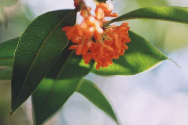 木犀科の常緑小高木。秋、葉のつけ根に黄橙色の小さな花を多数つける。強い芳香を放つ。 2004.10.15 自宅黄葉する 時になるらし 月ひとの 楓の枝の 色つく見れば 万葉集 大伴家持 10-2202 月には楓の木があるとする中国の伝説から、月人の楓は実在の植物ではないとする説が有力であるが、 金木犀や桂とする説もある。