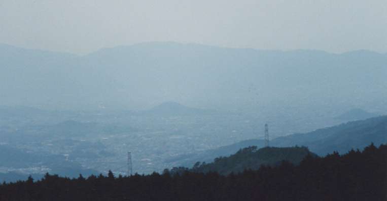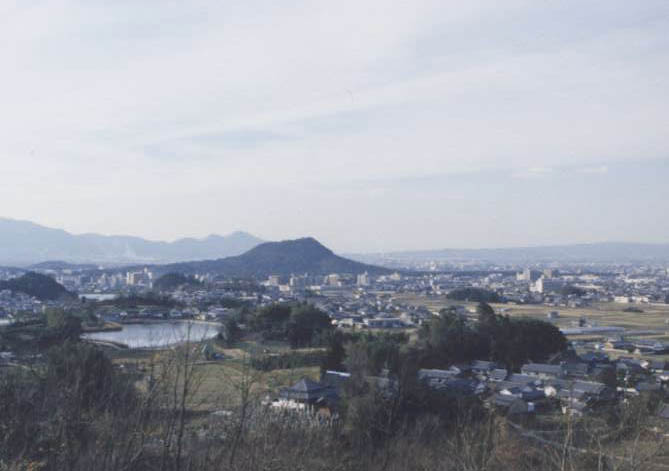 鳥見山より大和三山を望む。右耳成山、中央畝傍山、左香具山。