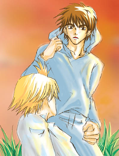 いつもなら必ず追っかけに見つかっては追いまわされるはずの繁華街。 そこをとおりぬけても誰も自分を振り向きもしない。 通り道にあったクレープ屋で買い食いしちゃおうとお店の人に声をかけたのにまるで俺をシカトしてるみたいにこちらを見てもくれない。 繁華街を3分の2くらい歩いた頃にはさすがにおかしい事に気付いた。 だけど、その結論を認めるのは恐ろしくて・・・人ごみの真っ只中に立ち尽くした。 そんな俺の周りを通り過ぎて行く人。人。人。 気付くと真正面に白のジャケットに紫のシャツといういかにもチンプラっぽい人が立っていて、まるで俺の存在がまったく目に映っていないとでも言うように肩をいからせながらまっすぐつっこんできた。 (やばっ・・・ぶつかるっ。) ぼんやりと立ち尽くしていた俺は避けるのが遅れた。半身と半身がぶつかる。・・・その瞬間チンピラは俺の中を通り抜けて行った。 正面から歩いてきたのに、俺の存在に気付きもせず通り過ぎていった。 「うそだろ〜っ?」 両手で頭を抱えて歩道にしゃがみこんだ。そんな俺に誰も気付かずに、俺を踏みつけるようにして通りすぎていく。 幽霊。生霊。透明人間。 何に当てはまるのか良くわからないけれど、とりあえず自分がもう人間としての実体を持っていないことだけは認めなくてはいけないらしかった。 行くあても無くて、ただ町をさまよっているうちに、気付いたら河原に座り込んでいた。 沈んでいく夕日が黒美嵯川をオレンジ色に染めていく。 夕焼け色に染まっている空と景色を眺めながら、徐々に暗い色へと置き換わっていく景色と同様に気分も暗く塞ぎこんでいく。 誰も気付いてくれない、自分の存在がまったく認められない、それがこんなに恐ろしいことだとは知らなくて。 三角に折った膝を抱きしめた。 不覚にも涙が出そうになった。 幽霊とかが涙を流せるのか解らないけれど・・・。 流したところで誰も見ることはないのだから、我慢することないんだよな・・・なんて思った時、背後から声がかけられた。 「桜庭?」 なんで彼が俺を見つけられたのかなんて知らない。 なんで俺に気付いてくれたのかも知らない。 でも・・・俺がここにいるのだと進が気付いてくれた。それが嬉しかった。