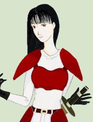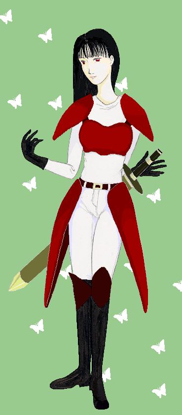 髪は黒、肩より少し下ぐらいまでの長さ。目は赤。装備は、赤で統一されたショルダーガードとチェストガード、ミドルガード。色んなところに隠し武器を持っている。装備の下に着ているのは、白いTシャツと白い長ズボン。手袋とブーツは黒。 |
