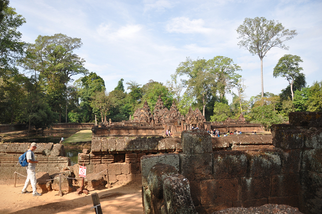 アンコールワットから北へ20キロ、10世紀後半に建てられたヒンドゥー教の寺院。赤色砂岩と紅土でできているため、全体が赤い。壁面に施されたレリーフは驚異的な精巧さで、彫りも深い。赤色砂岩は硬質なため鮮明に原形を留めてる。”東洋のモナリザ”と称されるデヴァターや、守門神ドヴァラパーラなど、とくに見応えがあります