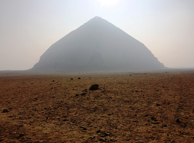 | カイロの朝は霞んでいます。スモッグと霧の為せっかくのギザのピラミットが見えないとのことでした。午前と午後の予定を変更して午前はカイロ近郊のメンフィス・サッカラ・ダハシュール観光に当てました。 ダハシュールにはクフ王の父にあたるスネフェル王の者とされる屈折ピラミットと赤のピラミットがあります。屈折ピラミットは、途中で勾配の角度が変わっています。 赤のピラミットは大変美しい2等辺三角の形で確かに赤色を帯びた色です。真正ピラミットとしては最古のもの。 サッカラの階段ピラミットはピラミットを最初に造ったジォセル王のものとされています。 他にセド祭壇、葬祭殿といった建物が残り、ピラミットコンプレックス(複合建築)の仕組みとなっています。 |