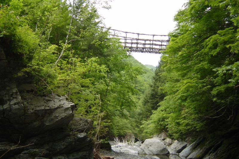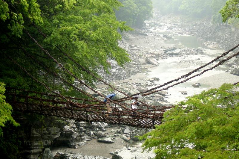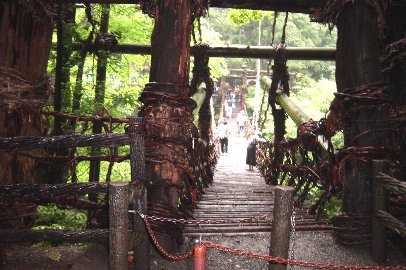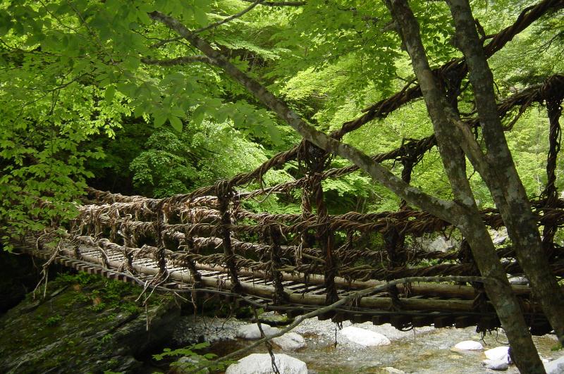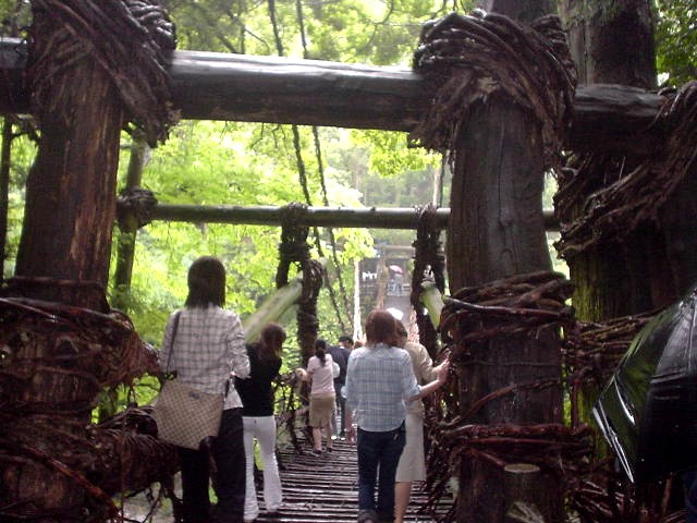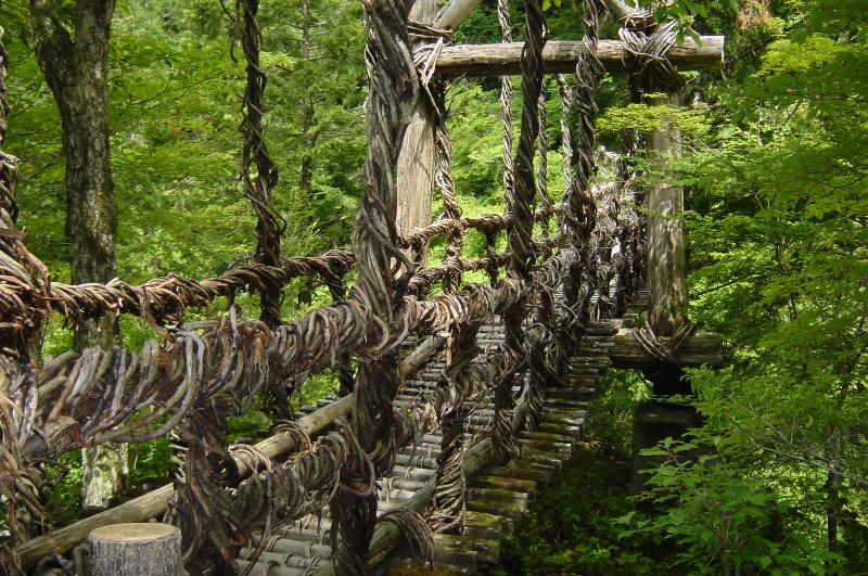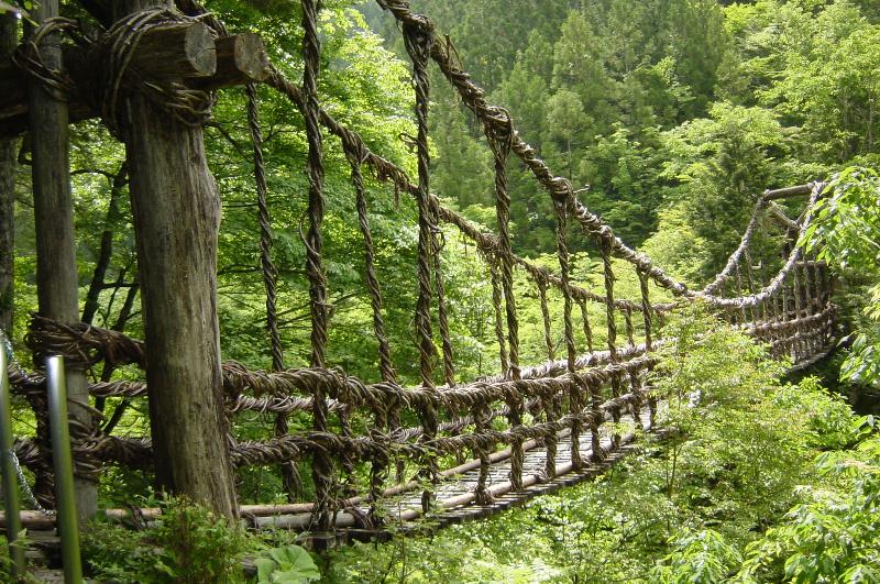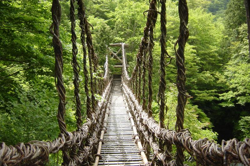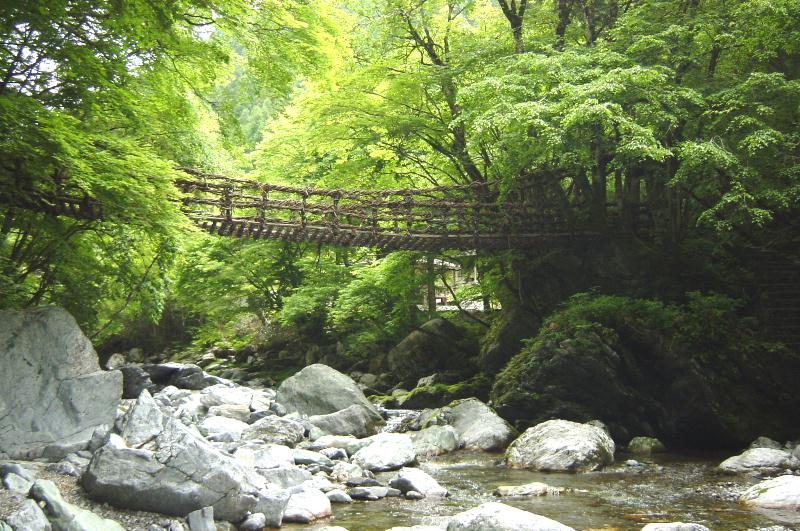 3大奇橋の一で重要民俗文化財の指定を受けています。源氏の追っ手を防ぐ為、断ち切り易いようになっています。 ”しらくち蔓”で出来ていて3年に一度作り変えられます。足元から下の川が見えゆらゆら、揺れてなかなか怖いものです。 近くには平家の落人達が古都の生活をしのび、琵琶を奏でつれづれを慰めあったと伝えられる、琵琶の滝があります。