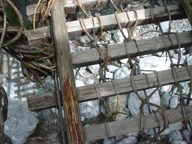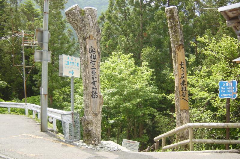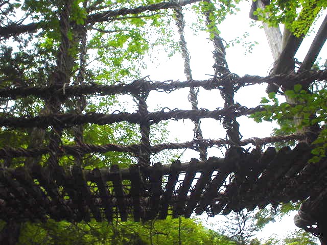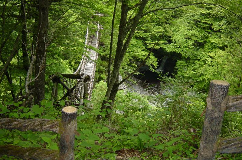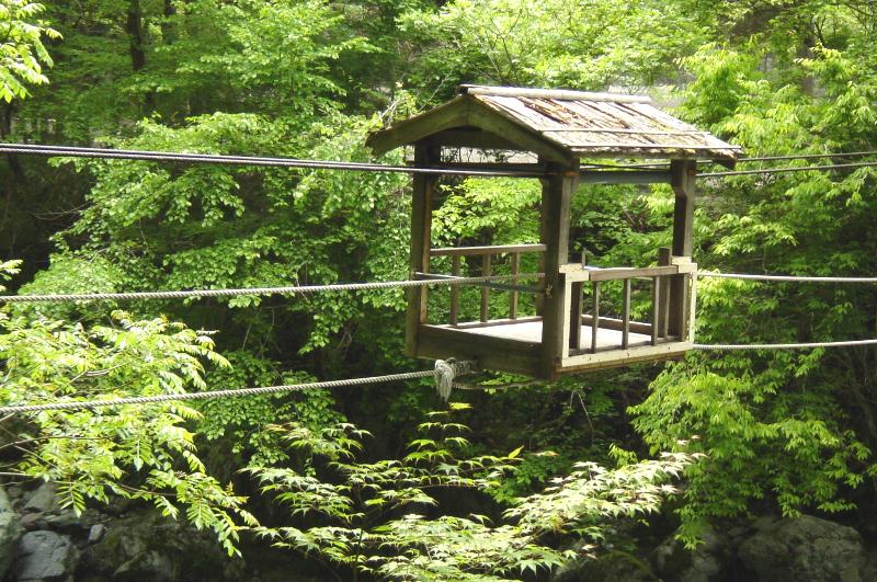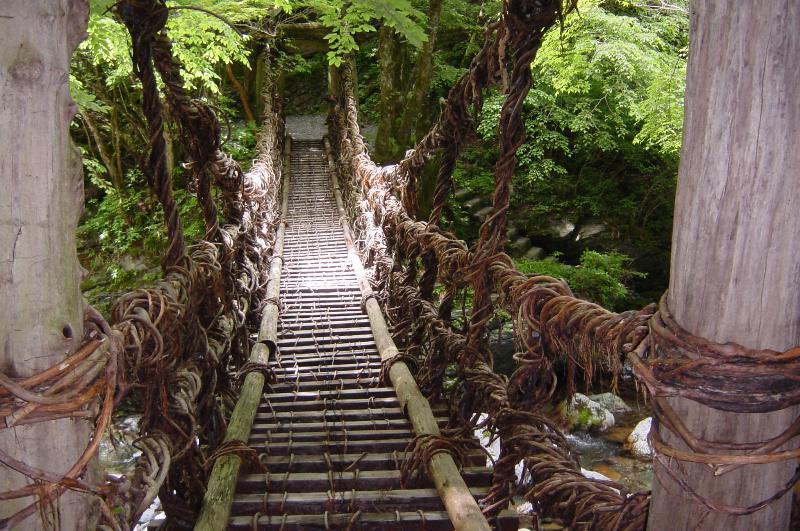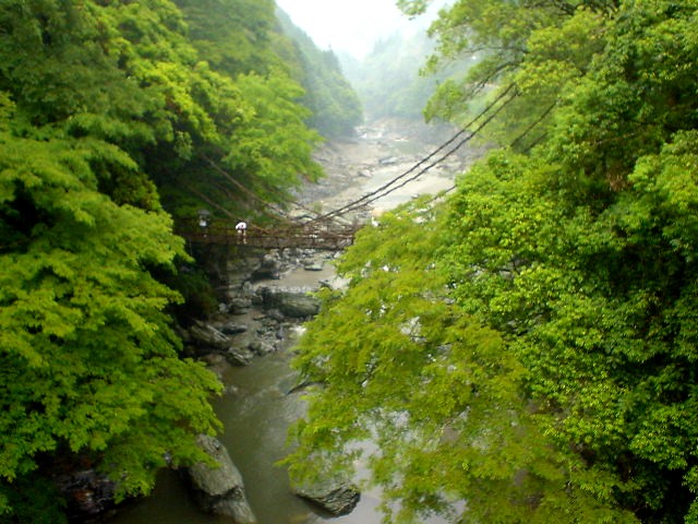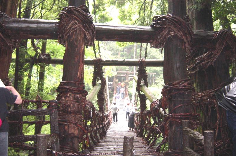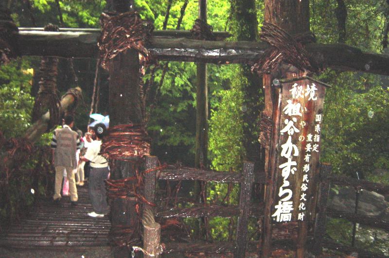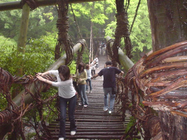 3大奇橋の一で重要民俗文化財の指定を受けています。源氏の追っ手を防ぐ為、断ち切り易いようになっています。 ”しらくち蔓”で出来ていて3年に一度作り変えられます。足元から下の川が見えゆらゆら、揺れてなかなか怖いものです。 近くには平家の落人達が古都の生活をしのび、琵琶を奏でつれづれを慰めあったと伝えられる、琵琶の滝があります。