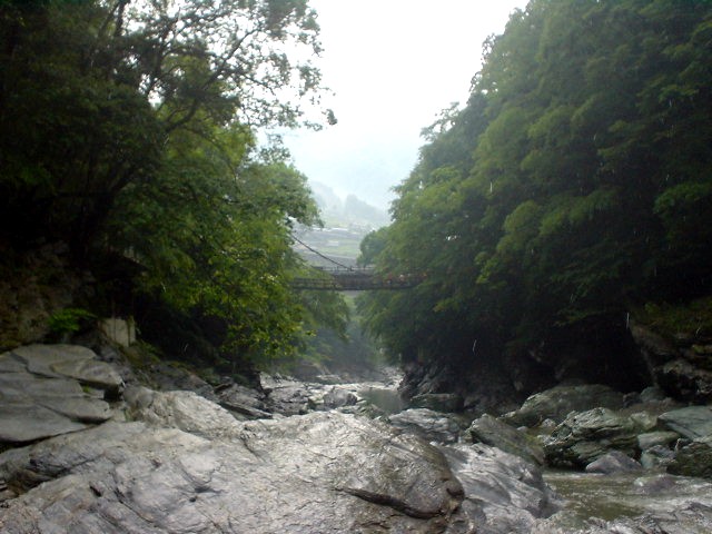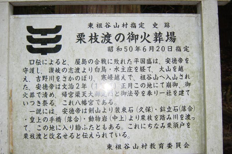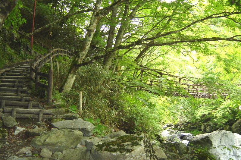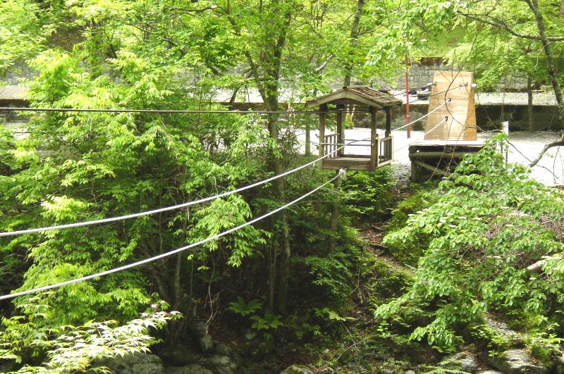 西祖谷から車で更に1時間あまり奥に行くと、男橋、女橋の二つのつり橋があり夫婦橋とも言われています。 原生林の中で静寂そのものです。近くには人力で渓谷を渡る”野猿”もあります。トライしてる方も居られました。 安徳天皇が崩御された時、火葬にしたと伝えられる、栗枝渡八幡神社もあります。