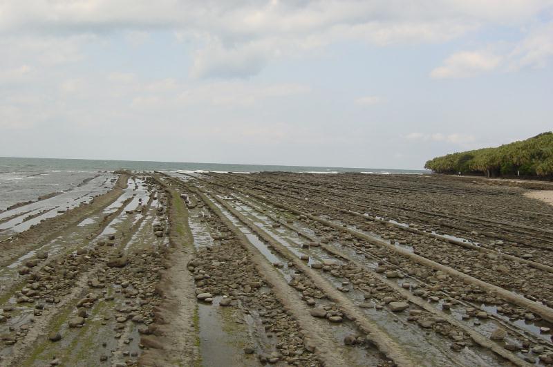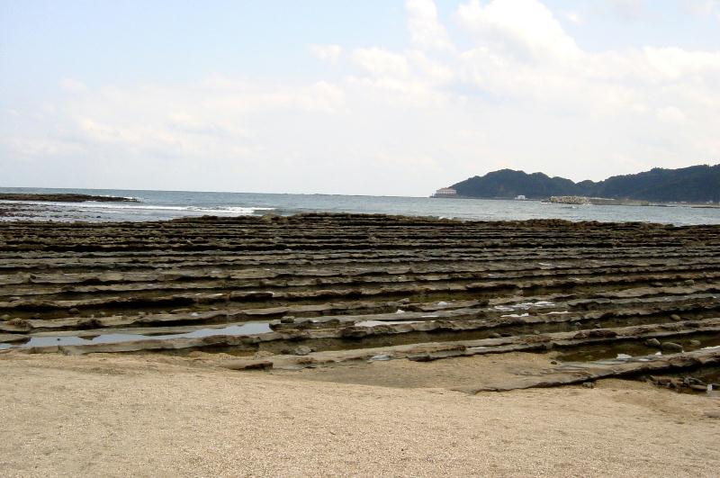 【青島】 島の周りを「波状岩」俗に「鬼の洗濯板」に囲まれています。約1500〜3000万年前に海中で出来た水成岩(砂岩と泥岩の累層)が隆起し、長い間の波蝕により出来たもので、青島から南の巾着島までの約8kmの海岸線に見られます 青島神社の祭神は海幸、山幸の伝説で知られる山幸彦(ヒコホホデミノミコト)とその妻豊玉姫(トヨタマヒメ)と塩土の翁(シオツチノオキナ)。
