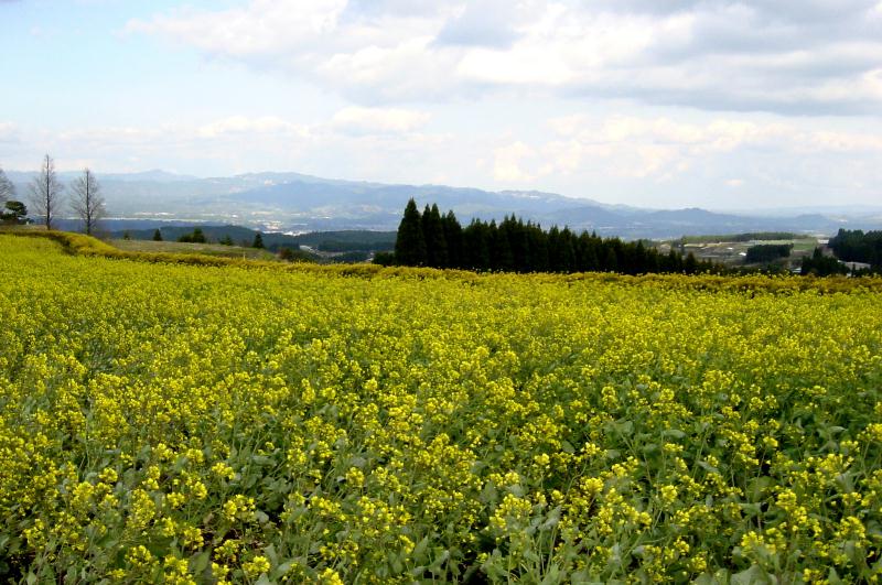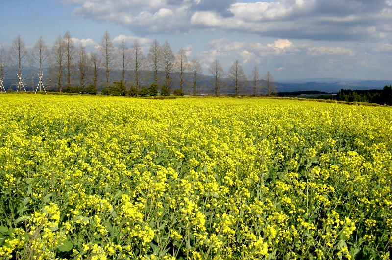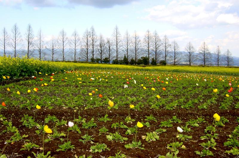 【生駒高原】 霧島山のすそ野にあたり、雄大な展望と咲き乱れる季節の花で有名です。ちょうど菜の花の花盛りでとても素敵でした。 アイスランドポピーも咲き出しました。秋には見事なコスモスが見られるとのことです。 メタセコイヤの木立がなんとなく、北海道の景色に似ていました。