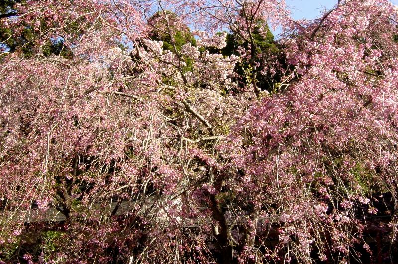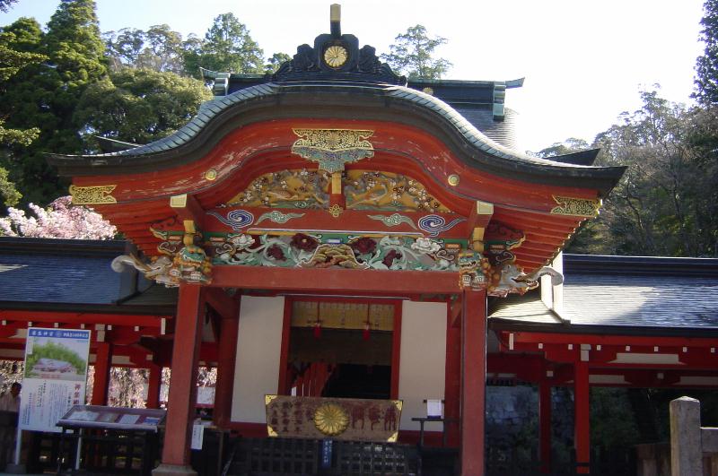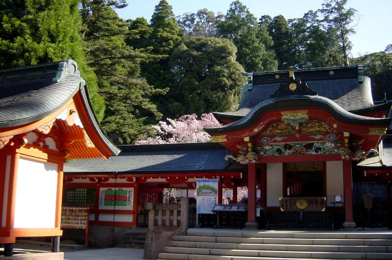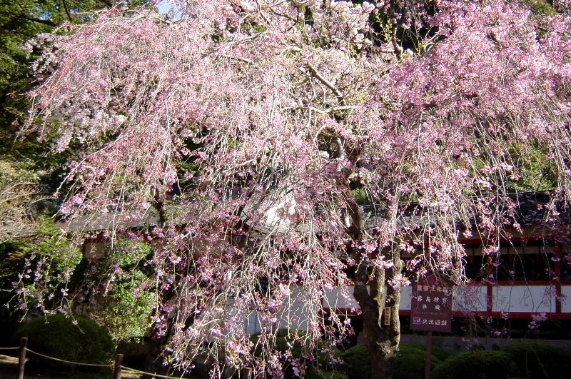 【霧島神宮】 天照大神の孫ニニギノミコトを奉っている神社です。杉の木でありながら一部にヒノキが混じっている御神木や、君が代の「さざれ石」などもありました。元は高千穂峰の山頂近くにありましたが、度々の火山の爆発により約500年前にこの地に移築されました。 神殿左の紅枝垂桜が咲き出しました。
