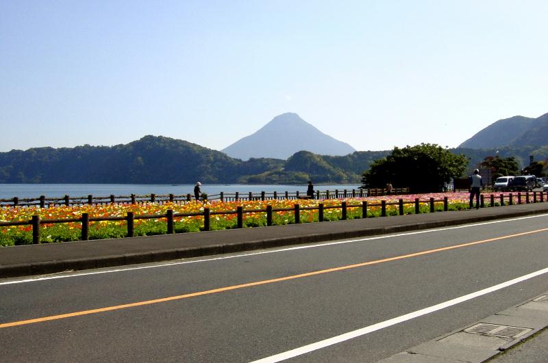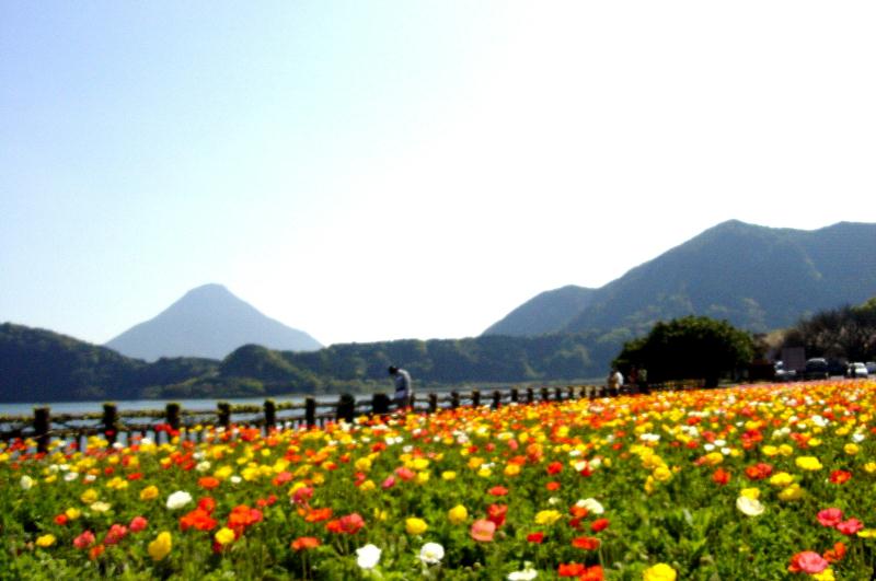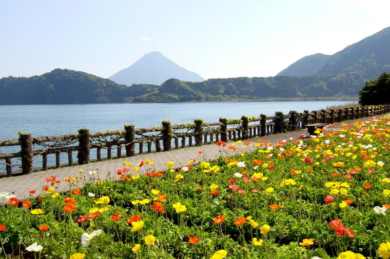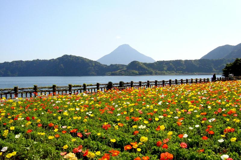 【池田湖】 池田湖は、約5500年前の火山活動によってできた周囲15km、水深233mの九州最大の湖です。 湖水は藍色に澄み、薩摩富士と呼ばれる開聞岳が望めます イッシー伝説でも有名です。丁度ポピーが満開でそれはそれはきれいでした。