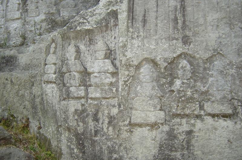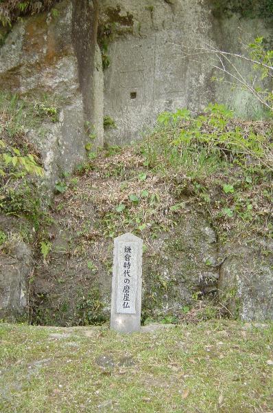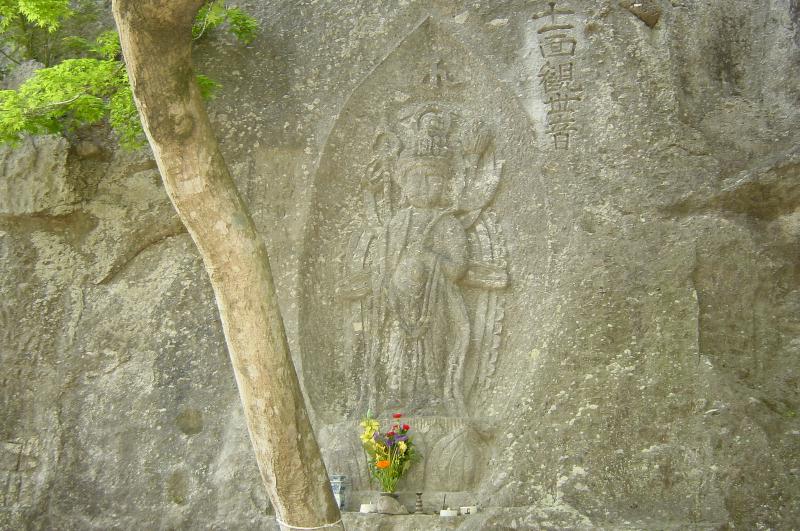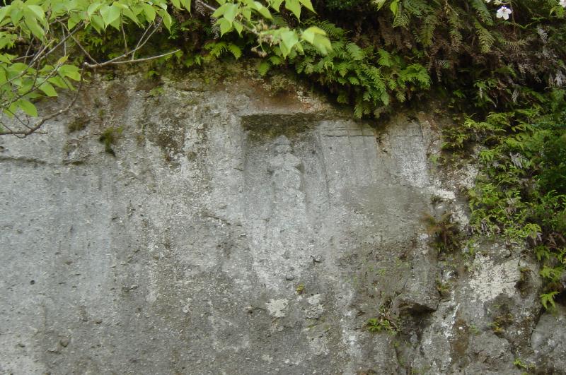 【清水磨崖仏】 清水川右岸の高さ約20m、長さ約400mの屏風のような岩壁に、五輪塔や宝篋印塔、梵字、仏像など200基が彫刻されています