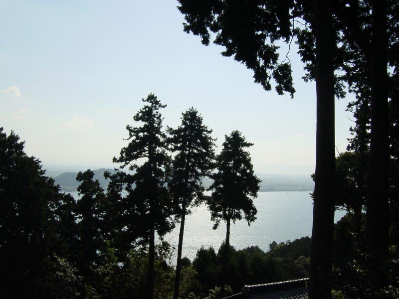 本堂 三重塔など重文の建つ境内から琵琶湖が一望できます。 |
