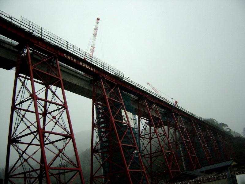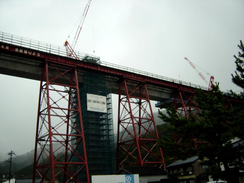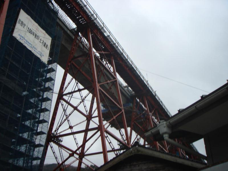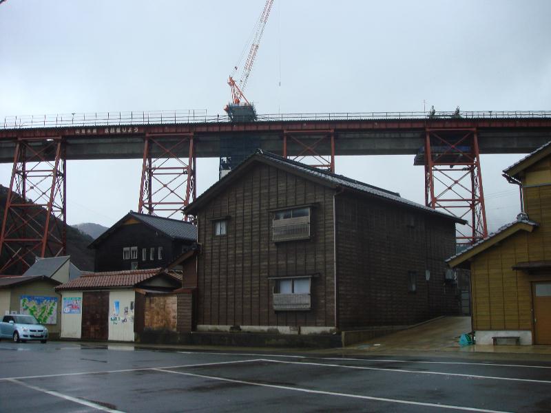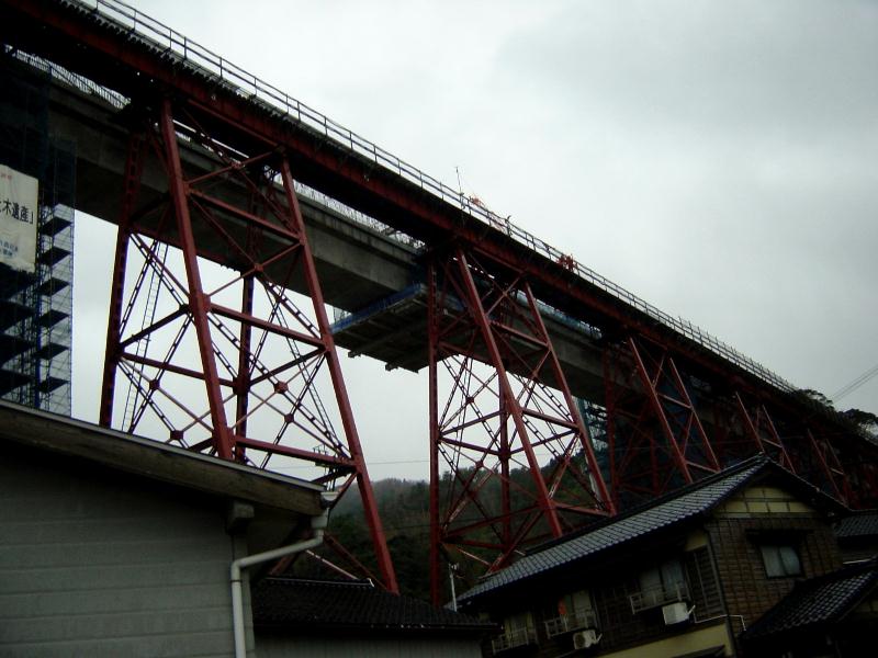 明治45年に2年の歳月と33万余円 の巨費を投じて完成されました。建築様式は トレッスル式で、 高さ41、45メートル 長さ310、59メートルの規模。トレッスル式鉄橋では日本一の 規模を誇っています。 昭和61年12月28日鉄橋を通過中の香住発浜坂行き回送列車が日本海からの突風にあおられ7両が転落、真下にあった水産加工場や民家を直撃という悲惨な事故がありました。現在建て替え中。