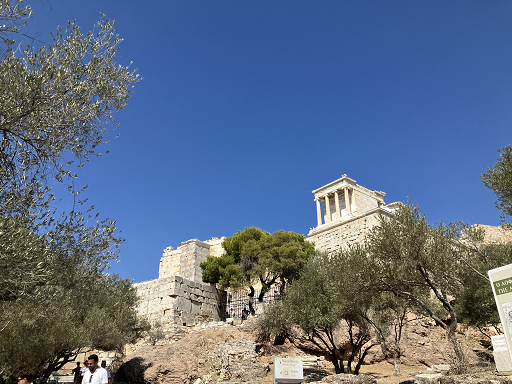 アテネはギリシア共和国の首都で、ギリシアの全人口の約3分の一を抱え、政治、経済、文化の中心地です。古代ギリシアの面影が残るアクロポリス他多くの遺跡があります。アクロポリスはアテネの守護神アテナをはじめゼウスやポセイドン、アルテミスなど複数の神を合祀し、出土品の多くは、アクロポリス博物館に収納されています。階段や床は大理石で出来ていて、滑りやすく、頂上は風が強く、ギリシアの国旗がはためいていました。