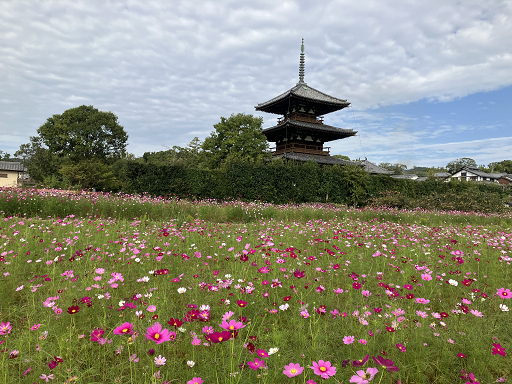聖徳太子建立のお寺。法隆寺の五重塔、法起寺の三重塔、法輪寺の三重塔と合わせ斑鳩三塔と呼ばれています。地元の方の尽力で付近にコスモスが植えられ、絶好の景観に見とれました。静かな境内もいかにも斑鳩の里に相応しい、佇まいでした。