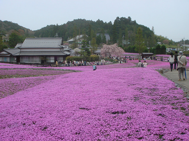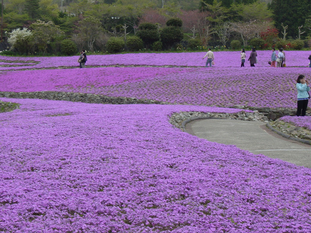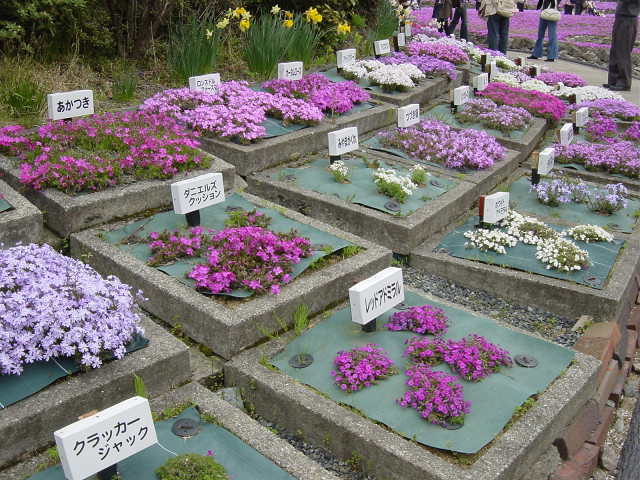 | 全国から集めた50余品種の芝桜。4月中旬頃から5月中旬頃まで開園 | ||