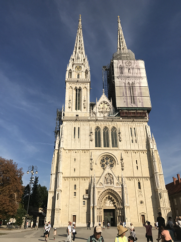 | 昼食後、プリトヴィッツェから、クロアチアの首都ザブレブへ移動し夕刻に着きました。まだ明るいので明日の予定の聖母被昇天大聖堂を見学しました。残念なことに、補修工事で片方の尖塔が覆われていました。 13世紀から18世紀にかけて創建されたもので、高さ100m以上あるという尖塔が二つあります。 入り口の彫刻が素晴らしさ、内部の祭壇、説教壇など、見応えがあります。ザブレブの大司教 アロイジェ・ステピナッツの実際の遺体は大聖堂の地下に埋葬されています。 |