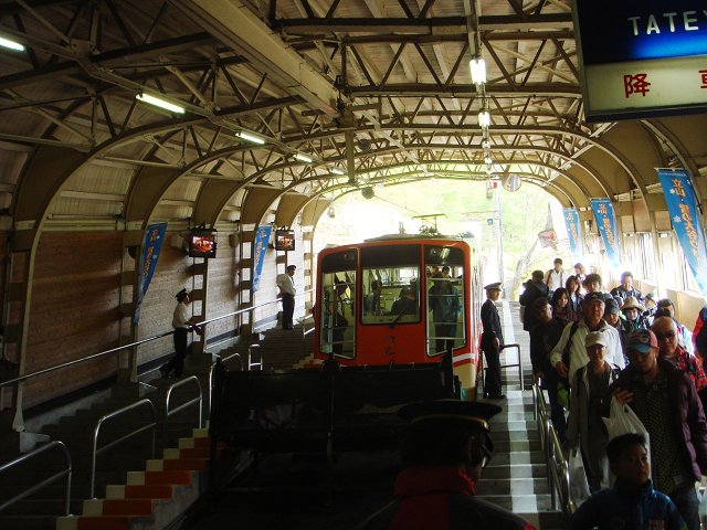 ロープウェイ80人乗りで5分。大観峯の展望台からは立山連峰と黒部ダムが見えます。 トロリーバスは地下トンネルを10分乗車