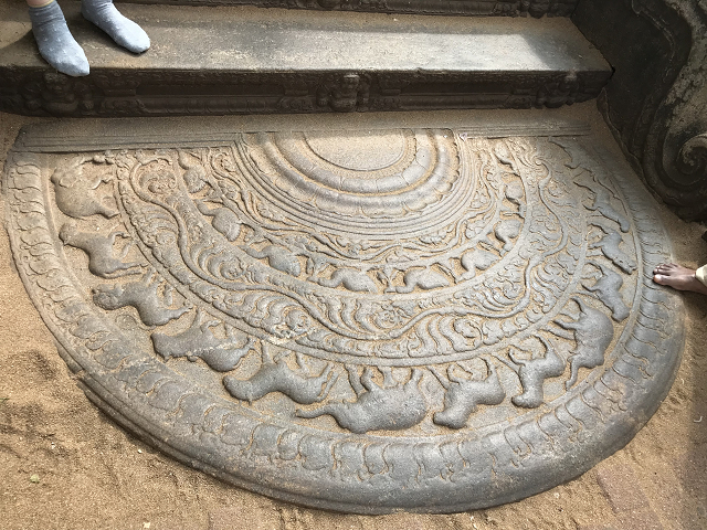 | 半円形のマットのような 、ムーンストーンはスリランカの聖地の入り口には必ずあります。 |