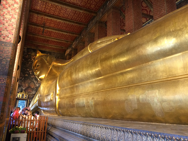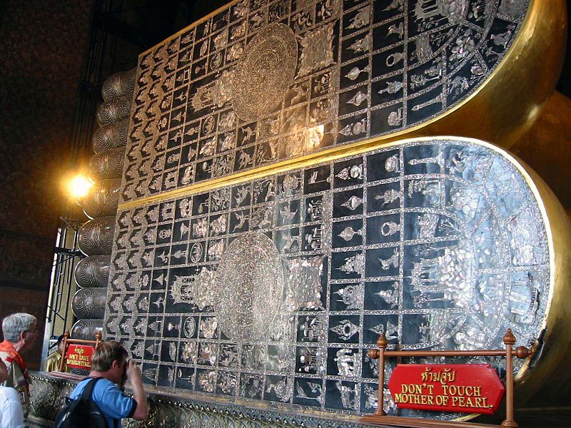 | バンコク最古の仏教寺院で、全長46メートル、高さ15メートルの巨大な黄金の涅槃像で有名です。アユタヤ王朝末期のプラペートラチャ王時代(1688〜1703年)に建立されたといわれます。バンコク王朝のラーマ3世(1824〜1851年)が17年をかけて長さ46メートルの涅槃像を祀る本堂とその回廊、礼拝堂、71もの仏塔を建立させました 。 この涅槃像は悟りを開いた釈迦が涅槃に入る直前を表していて 穏やかな顔をされています。長さ5メートル、幅1.5メートルの大きな足の裏には、螺鈿細工で仏教と深い関わりを持つバラモン教の宇宙観が表現されています。 ※ ウィキメディアからお借りしています 涅槃仏は後ろからも拝見することができます。 高さ42mでカラフルなタイルで装飾されている4つの仏塔がありますが、これは現王朝の歴代の王、ラーマ1世から4世までのお墓です。 タイ古式マッサージ発祥の地で、ワット・ポー伝統医学校が敷地内にあります。 |