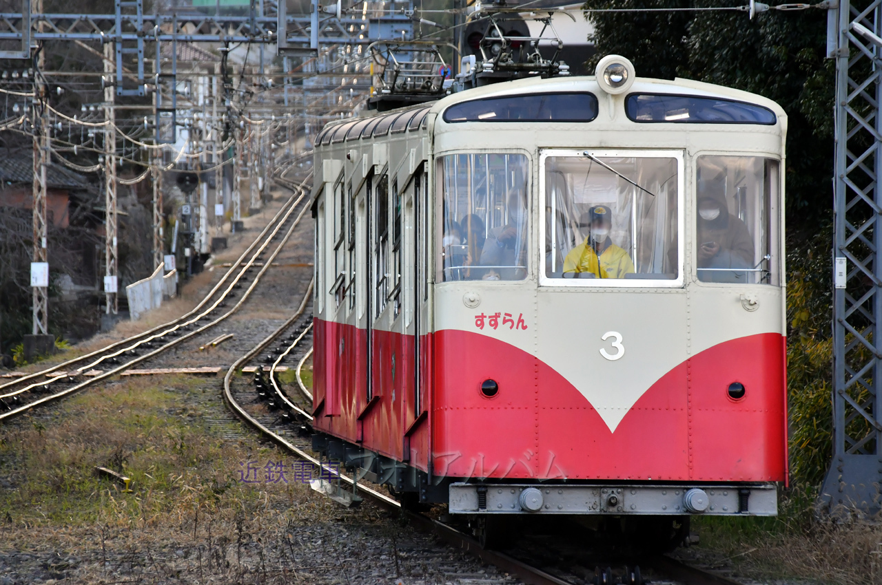 | 夕刻、生駒駅に訪れた時に何となく生駒ケーブル方面に歩いていくと2号線が運用していました。宝山寺方面から下って来たコ3「すずらん」。 |