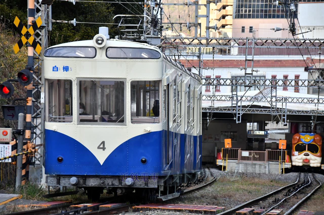 | 宝山寺駅で留置中のコ3「すずらん」。塗装復刻したものの愛称文字のフォントは変化していますね。 |