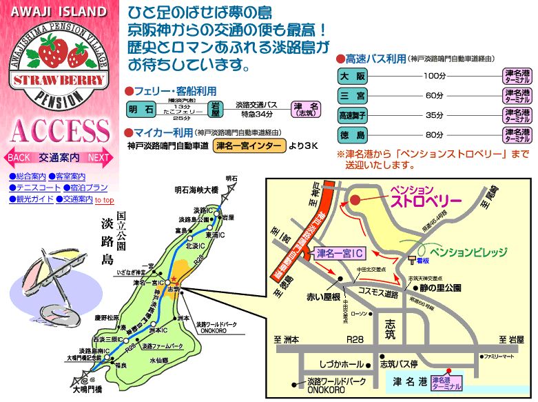 | 基本的には 生駒9時集合、車の乗り合わせで合宿先に向かいますが、集合場所や集合時間にあわせられない、等の理由で参加を残念したり・・ということもあるかと思いますので、一応その他の方法で行く場合の交通を掲載します。参考にしてください。 下図はペンションのホームページに掲載されているアクセス案内です。 ![]() 車以外で行く場合は高速バス【かけはし号】を利用するのが良いでしょう。 大阪から津名港ターミナルまで2時間弱です。 【例】JR大阪 10:00のバスに乗るとお昼ごろ津名港ターミナルに到着 ここからペンションまで送迎してくれます。 料金は大阪→津名港 片道2000円です。 高速バスの時刻表はこちら 高速バスの運賃表はこちら |
